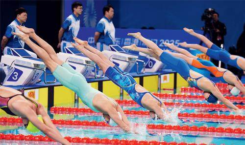 50米蝶泳比赛,选手们出发。 11月17日晚,全运会游泳比赛结束,浙江队在老将汪顺、徐嘉余的带领下,以11金继续领跑,山东队小将张展硕、河北小将于子迪异军突起,帮助山东与河北紧随其后,分别以7金和6金排在奖牌榜的第二、三位。上海、湖北、江苏、香港、天津、福建和江西队也有金牌收获,游泳比赛呈现百花齐放的局面。 本届比赛亮点颇多,人们既能看到老将的坚守,奋力争取更好的成绩,也有许多小孩哥、小孩姐横