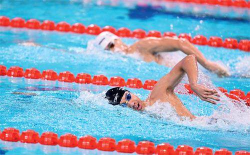 山东队选手张展硕(下)在比赛中。 横空出世 张展硕这届全运会的表现,完全可以用“横空出世”来形容。在游泳比赛产生的首枚金牌男子400米自由泳项目中,张展硕力压潘展乐、孙杨等一众好手,以3分42秒82的成绩夺金,打破了由他自己保持的世界青年纪录和全国青年纪录。 此后,这个青岛小伙就像“开挂”一般,11月12日晚进行男子200米自由泳决赛,他再次战胜众多高手,以1分44秒86夺冠。整个夺冠过程,