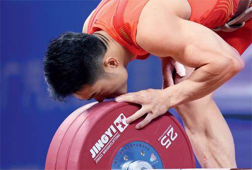 石智勇亲吻杠铃。 11月17日晚,第十五届全运会举重男子73公斤级比赛在东莞石龙中学体育馆进行,浙江队的石智勇在挺举比赛开把185公斤挑战成功,第二次试举189公斤失败,但仍手握争金主动权。赛前,这位32岁的两届奥运冠军表示,这将是自己的最后一届全运会。如果能取得优异成绩,就会坚持训练,明年在家乡宁波举行的世锦赛上为自己的运动生涯写下句号。 第三把挑战189公斤,石智勇仍未成功。向观众致意后,