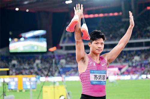 苏炳添在比赛后向观众致意。 苏炳添 高光谢幕 苏炳添是本届全运会耀眼的明星之一。开幕式上,他同香港、澳门选手一起点燃主火炬,宣示着全运会大幕拉开。在田径比赛中,他又上演压轴大戏,跑完了自己职业生涯的最后一个100米。11月20日是第十五届全国运动会田径比赛最后一天,也是男子100米亚洲纪录保持者苏炳添最后一次以运动员身份,出现在赛场上。 苏炳添来到起点,拿出卷尺,仔细丈量距离,调整起跑器的位