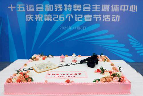 媒体中心为记者们准备了蛋糕。 11月8日 晴 今天是个特别的日子——记者节,虽然大多数人并不了解这个日子的来历,但记者们还是自娱自乐庆祝一番。在媒体中心,工作人员制作了巨大的蛋糕,用奶油勾画出全运会吉祥物、笔记本和胶片的图案,写上“庆祝第26个记者节”,家的氛围瞬间浓厚起来。记者们分享蛋糕,共同庆祝这个节日。 全运会开幕前一天,来自各地的记者大多已经就位,忙碌地做着准备。大型赛事是记者的一场