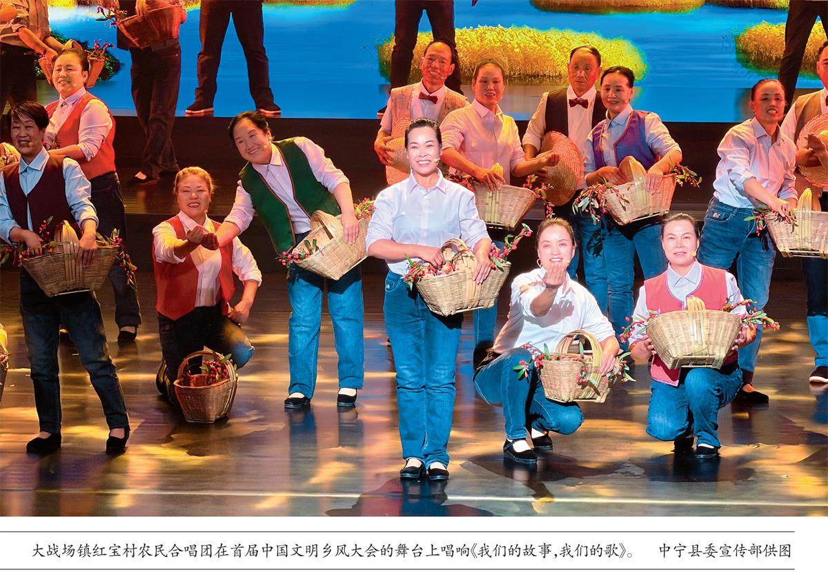 “我来自海原,我来自西吉,我来自固原,我们来自西海固……我们是农民,我们爱唱歌……”在首届中国文明乡风大会的舞台上,这群来自宁夏中宁县大战场镇的移民群众,用带着泥土气息的旋律唱响《我们的故事,我们的歌》。他们自信、耀眼,展现着新时代农民的风采;他们努力、拼搏,为了追逐梦想不断精进表演技艺,一如当年在荒滩上白手起家建设家园的奋斗姿态。 11月12日上午9时,记者来到大战场镇红宝村,采访刚从延安演出
